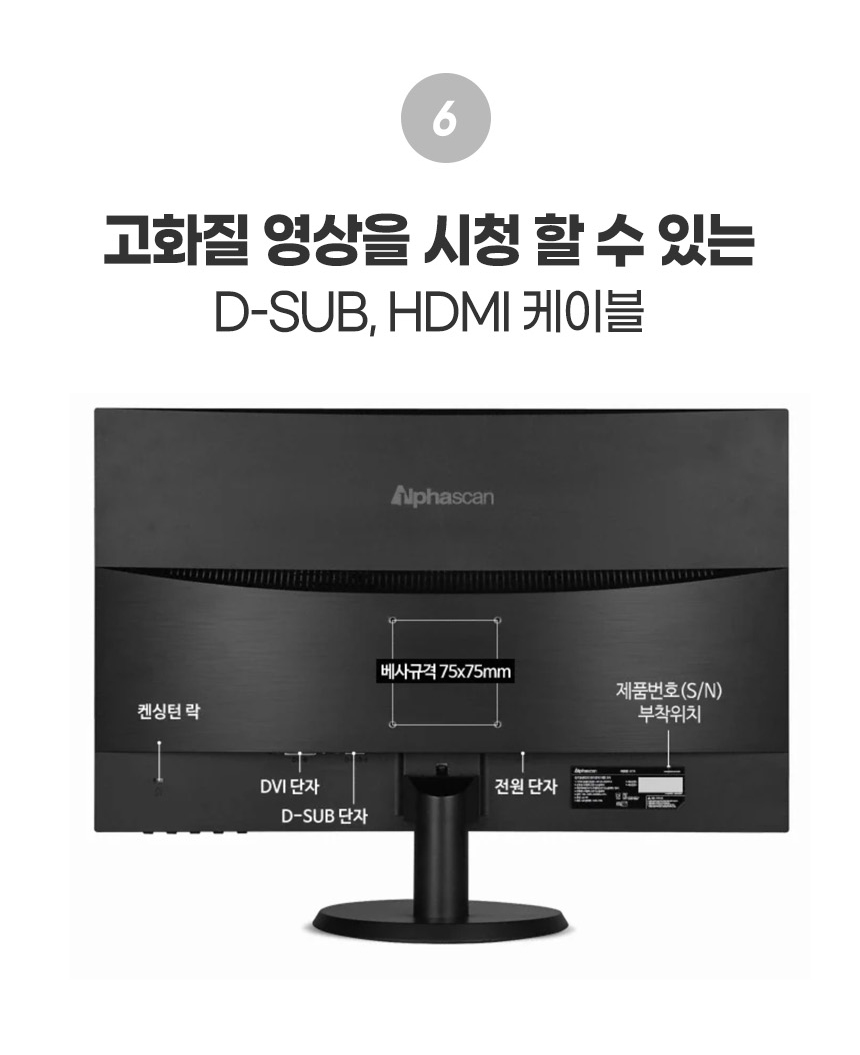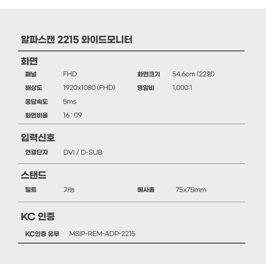 54.6cm(21.5인치)/1920x1080(FHD)/60Hz/TN/와이드(16:9)/평면/5ms/250cd/1,000:1/틸트(상하)/베사홀:75x75mm