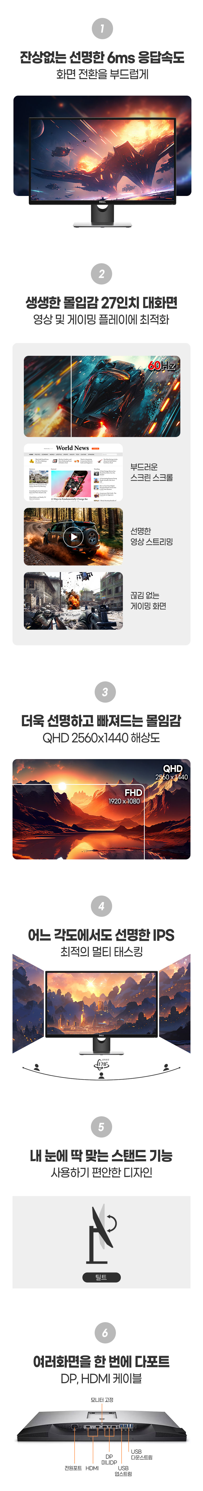 68cm(27인치) / 2560x1440(QHD) / 60Hz / IPS / 와이드(16:9) / 6ms / 피벗 / 엘리베이션 / 틸트 / 스위블 / 베사홀 : 100x100mm