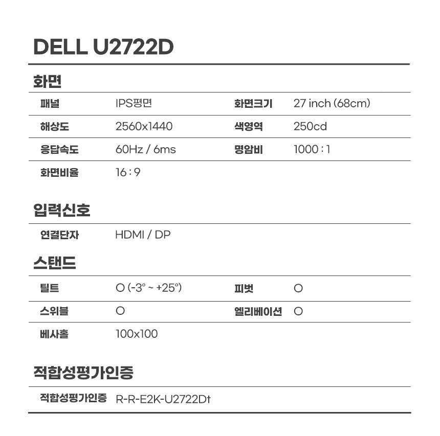 68cm(27인치) / 2560x1440(QHD) / 60Hz / IPS / 와이드(16:9) / 5ms / 피벗 / 엘리베이션 / 틸트 / 스위블 / 베사홀 : 100x100mm