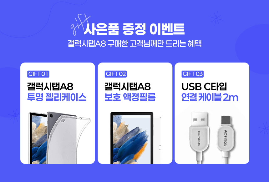 구성품 : 태블릿, 태블릿 충전케이블, 투명젤리케이스, 액정보호필름