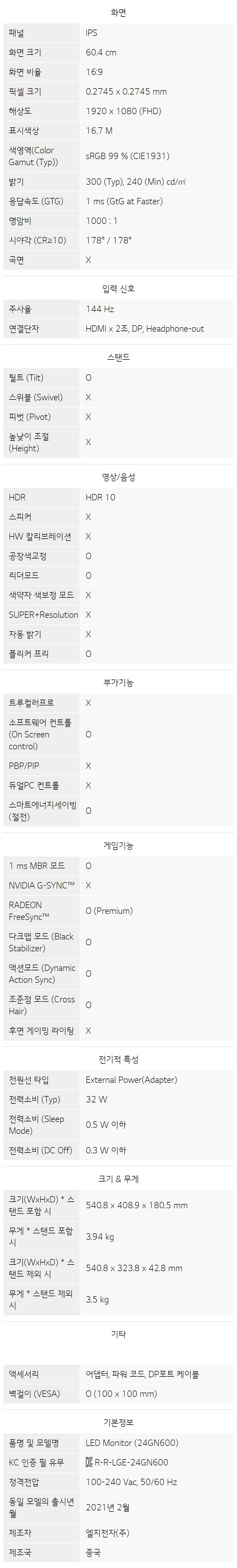 60.4cm(24인치) / 와이드(16:9) / IPS / 평면 / 광시야각 / 1920 x 1080(FHD) / 픽셀피치: 0.2745mm / 144Hz / 300cd / 플리커프리 / 블루라이트 차단 / 틸트 / 프리싱크 / HDMI / DP