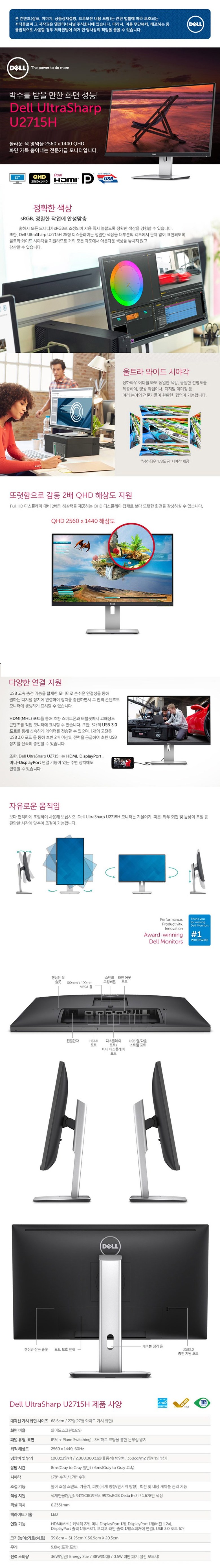 델 / DELL / 27인치 / U2715H / IPS / QHD / 2560x1440 / HDMI / DP / 피벗 / 엘리베이션 / 틸트 / 스위블