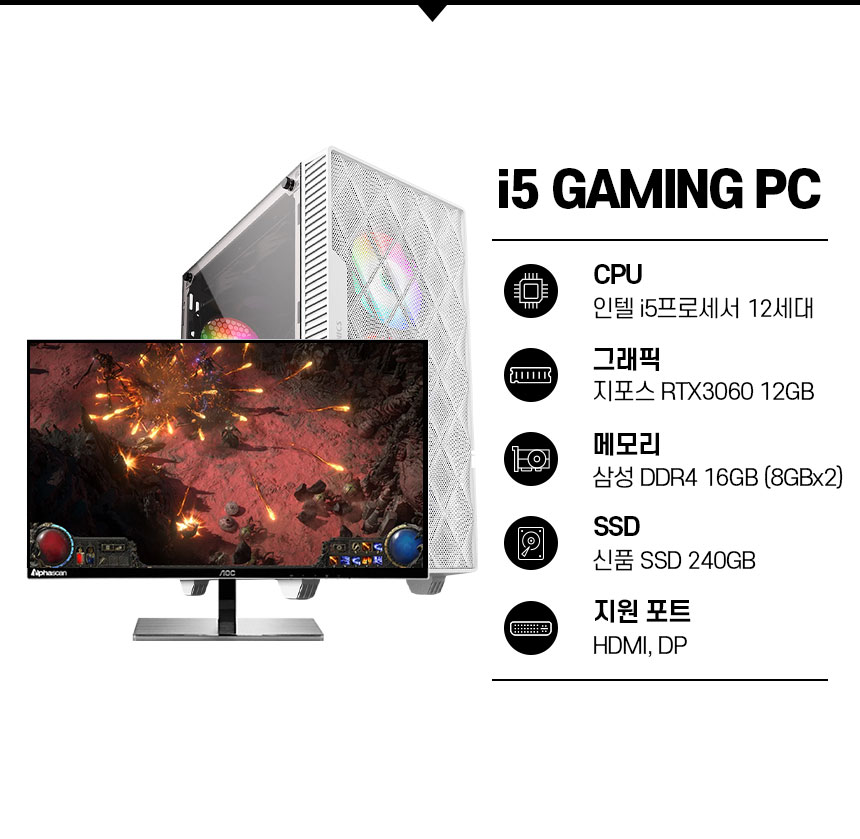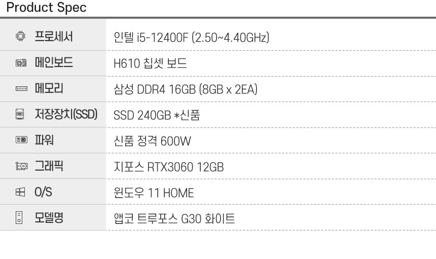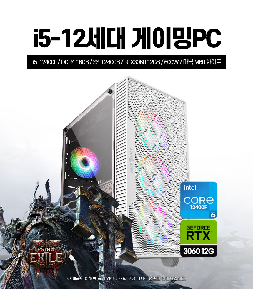I5 12400F/H610/삼성 D4 16G(8Gx2)/(신품) SSD 240G/RTX 3060 12G(HDMI/DP)/(신품)600W/마닉M60(화이트)/윈도우11 HOME