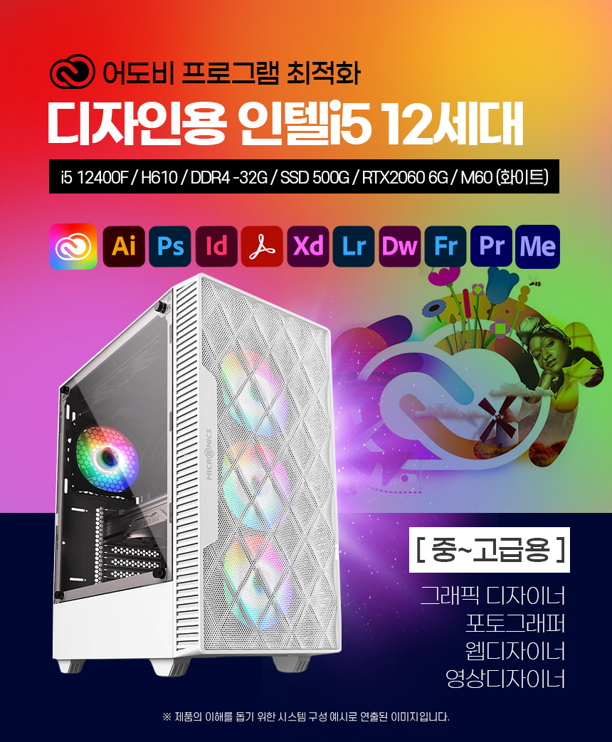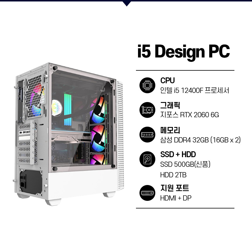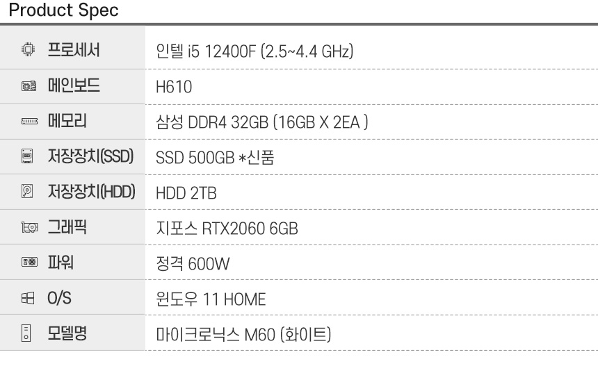 I5 12400F/H610/삼성 D4 32G(16Gx2개)/SSD 500G/HDD 2TB/RTX 2060 6G(HDMI/DP)/600W/M60(화이트)/윈도우11 HOME