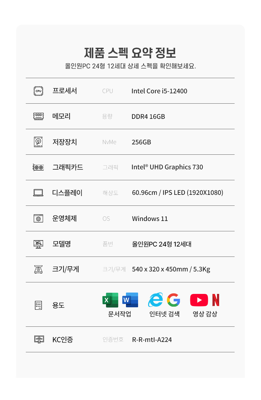 i5-12400/DDR4 16G/SSD NVMe 256G/Intel® UHD Graphics 730/1920x1080/24"/윈도우11