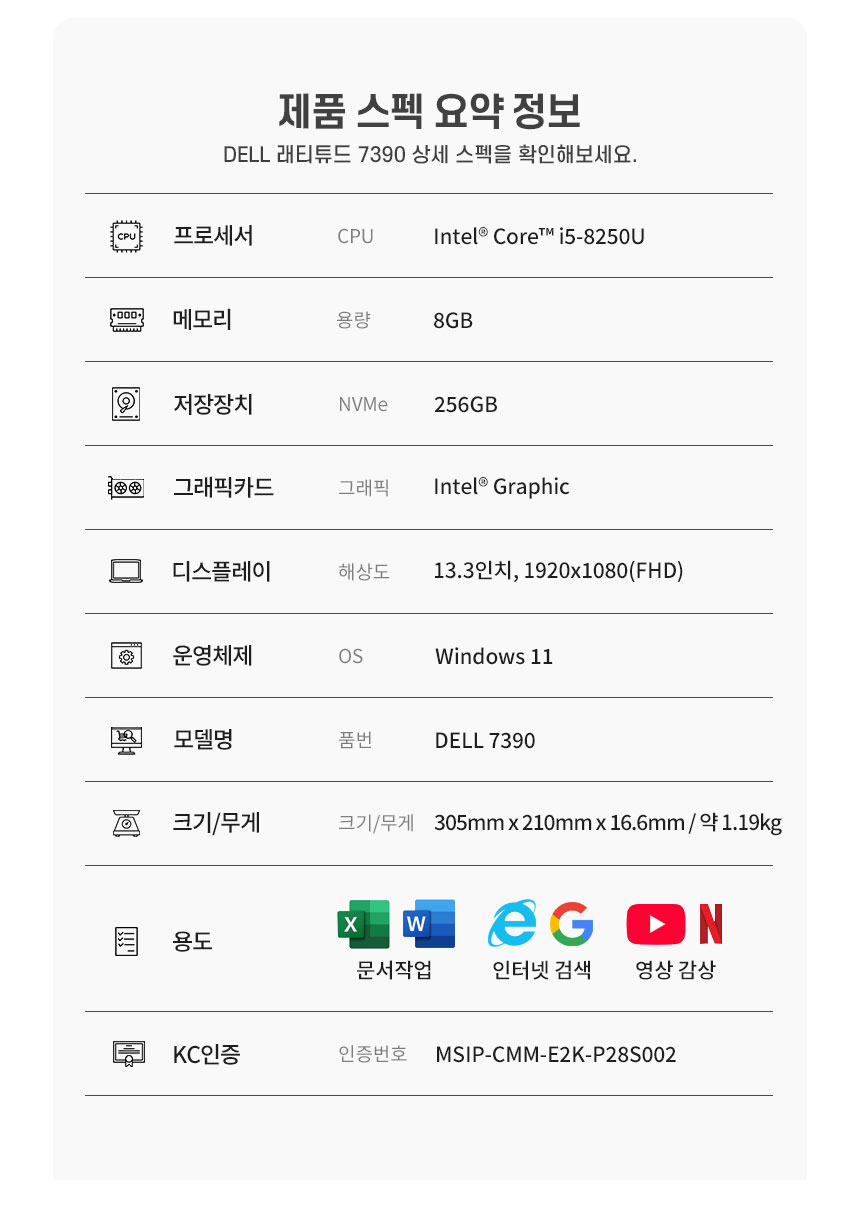 [15대 한정] DELL 7390 8세대 코어i5 사무용 윈도우11
