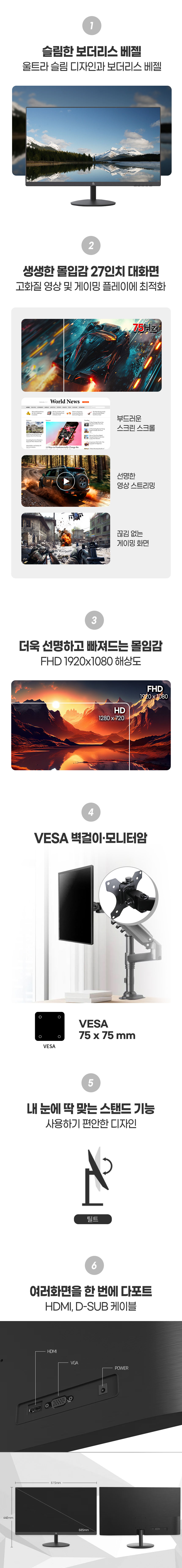 68.5cm(27인치) / 1920x1080(FHD) / 75Hz / PVA / 와이드(16:9) / 평면 / 4ms(OD) / 250cd / 틸트 / 베사홀 : 75x75mm / [게임특화] 조준선