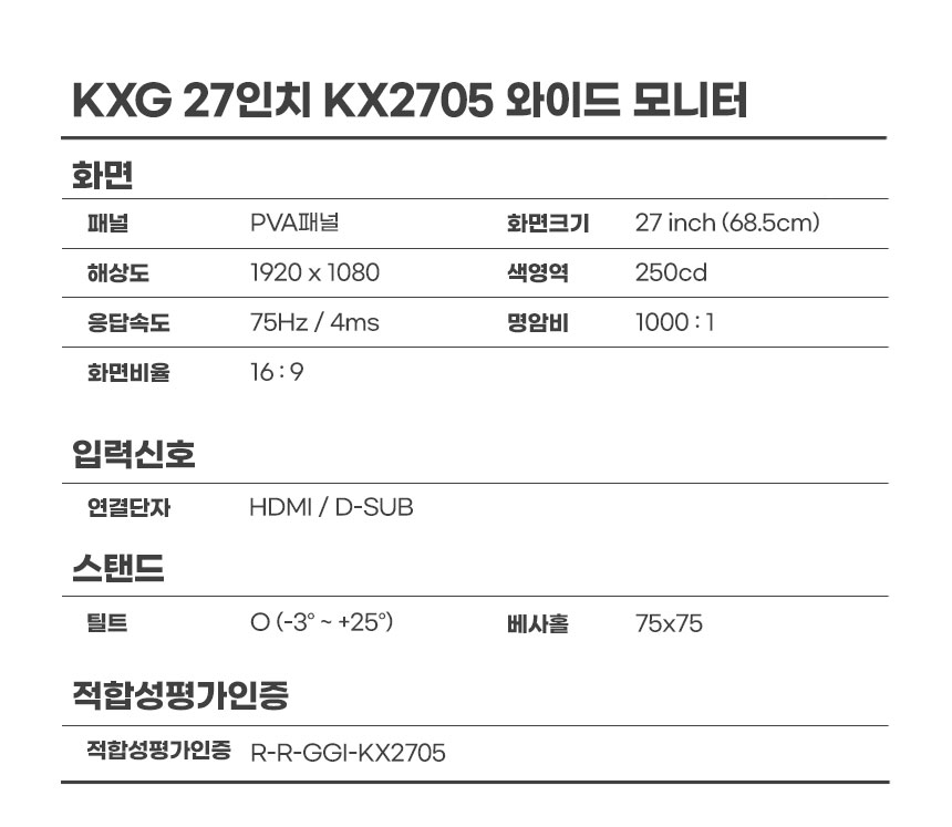 경성 27인치 KX2705 슬림 벽걸이 PVA 75Hz 게이밍 와이드 모니터