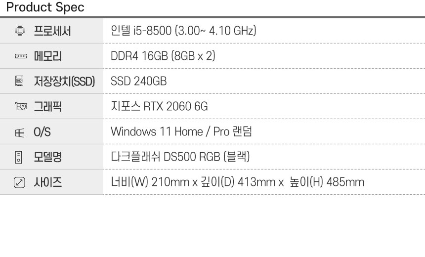 커피레이크 i5 8400/램16G/SSD 240G/RTX2060 6G/파워 600W/다크플래쉬 DS500 RGB (블랙)/듀얼모니터 지원