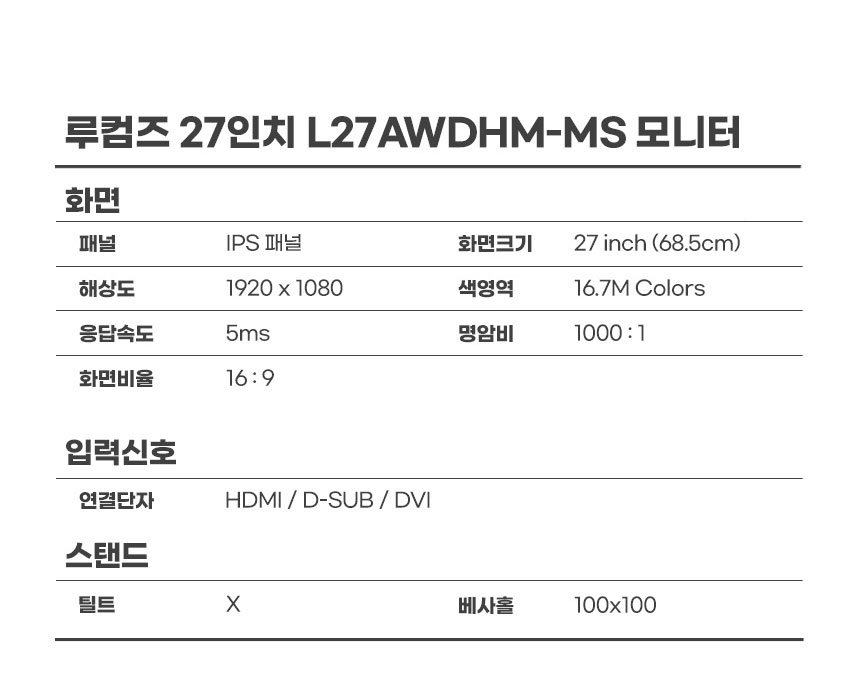 68cm(27인치) / 1920x1080(FHD) / 75Hz / IPS / 와이드(16:9) / 평면 / 5ms / 250cd / 베사홀 : 100x100mm