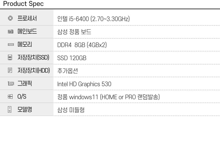 스카이레이크 i5 6400/램 DDR4 8G/SSD 120G/인텔 HD 그래픽/윈도우11/듀얼모니터 지원