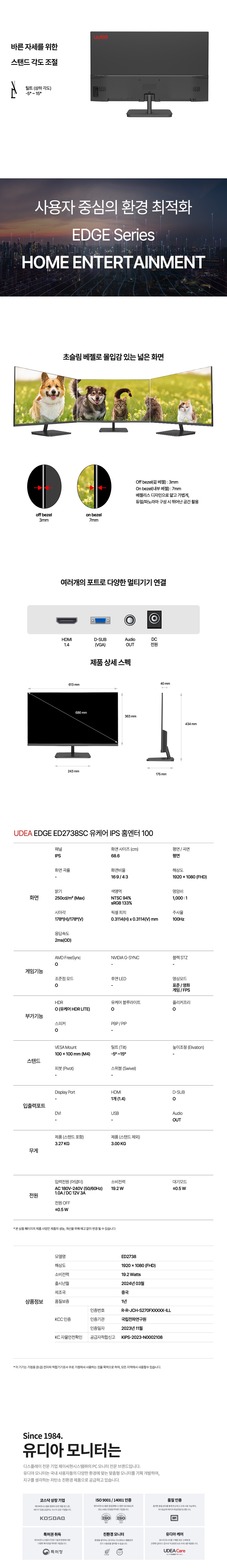 UDEA 27인치 ED2738SC 유케어 IPS 100Hz 스피커 내장 게이밍 베젤리스 와이드 모니터