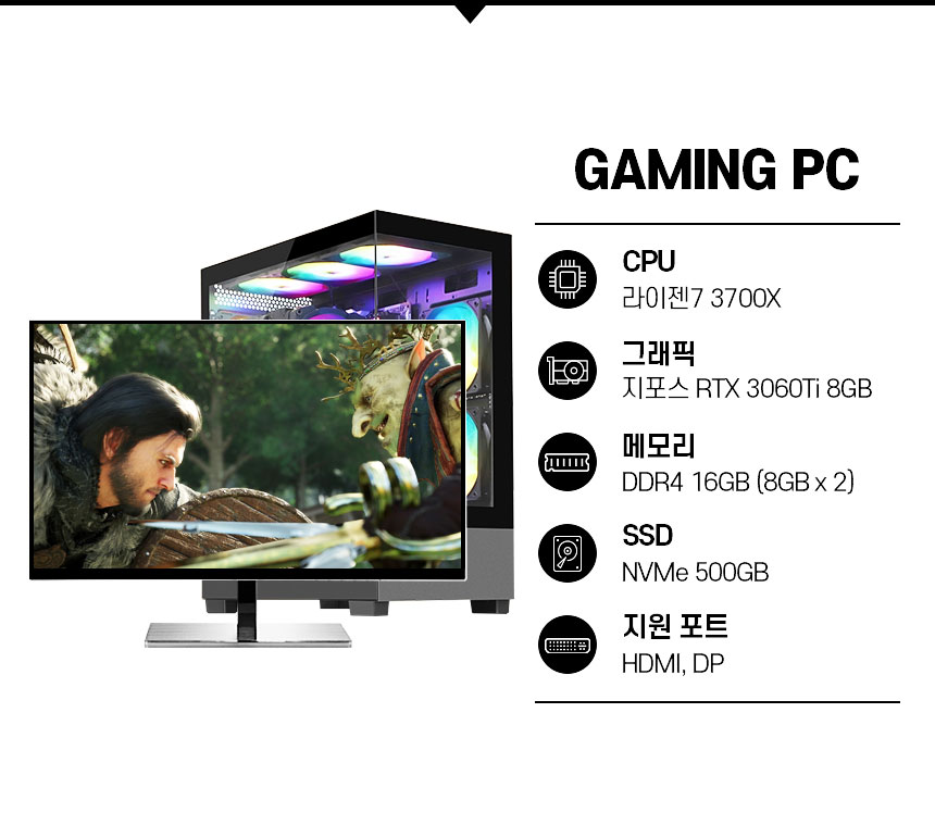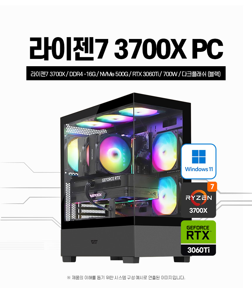 라이젠7 3700X/메모리 16G/SSD 500G/RTX 3060TI 8G /파워 700W/다크플래쉬 DS500 RGB (블랙)/듀얼모니터 지원