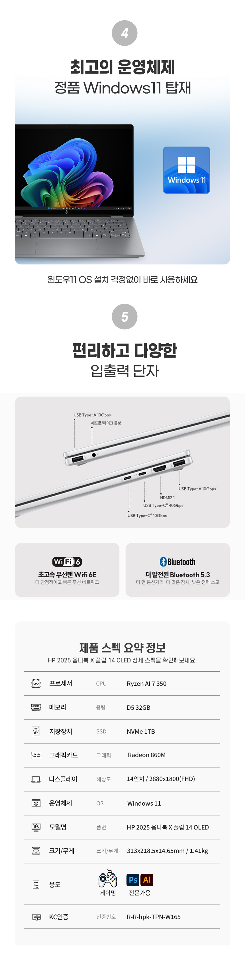 Ryzen AI 7 350/DDR5 32G/SSD NVMe 1TB/Radeon 860M/14"/2880x1800/윈도우11