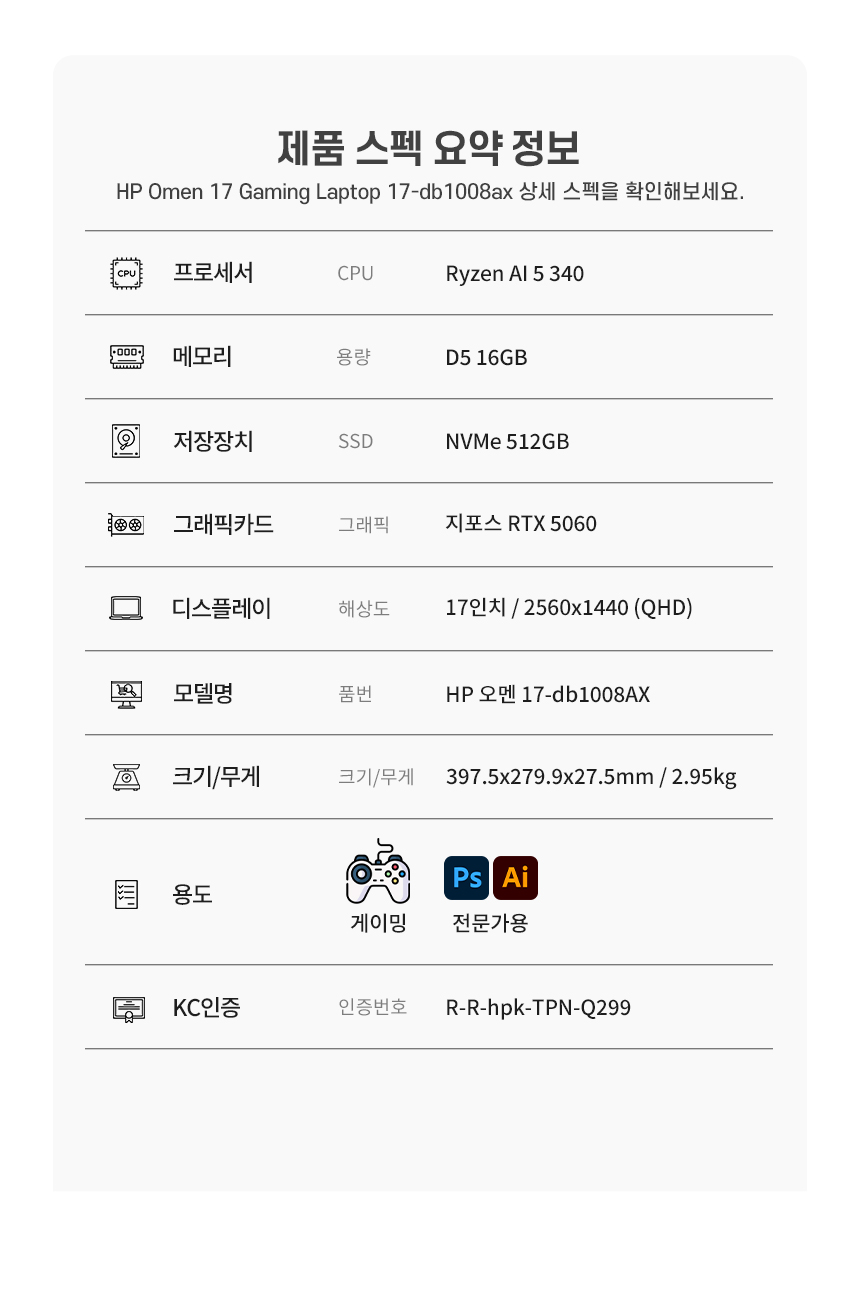 Ryzen AI 5 340 / D5 16G / SSD NVMe 512G / RTX 5060 / 17" / 2560x1440 / 윈도우11