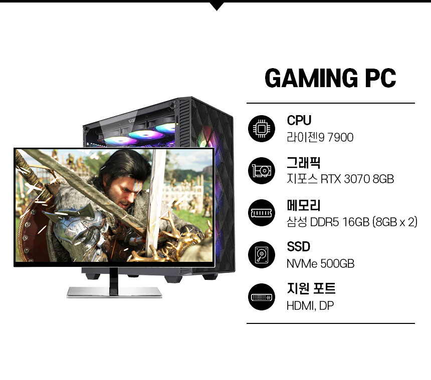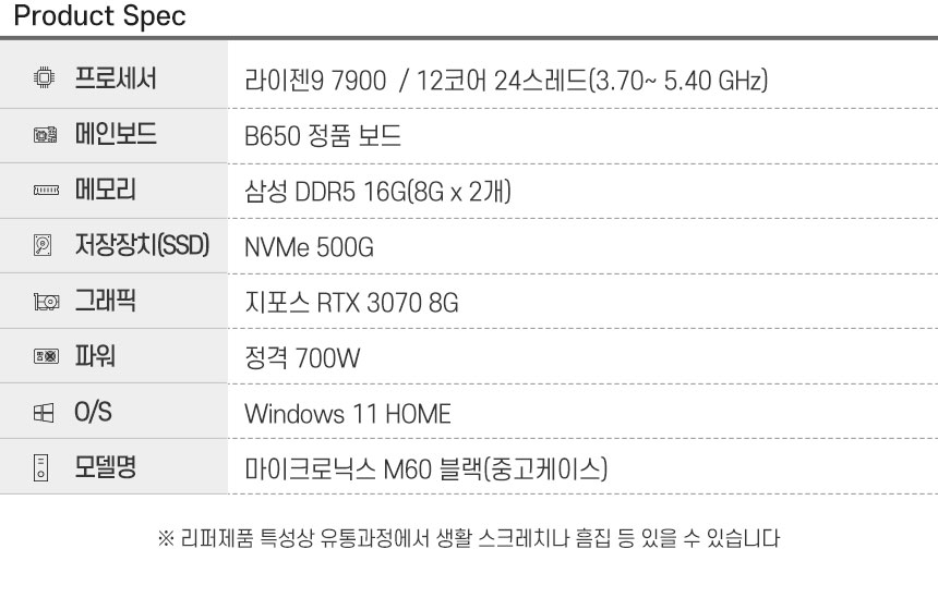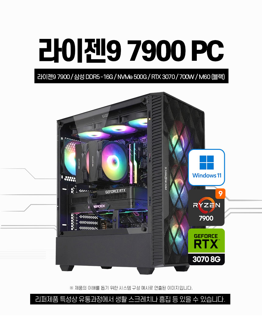 라이젠9 7900 라파엘/메모리 D5 16G/SSD 500G/RTX 3070 8G /파워 700W/마닉 M60(블랙)/윈도우 11 Home(정품)/한컴오피스 증정