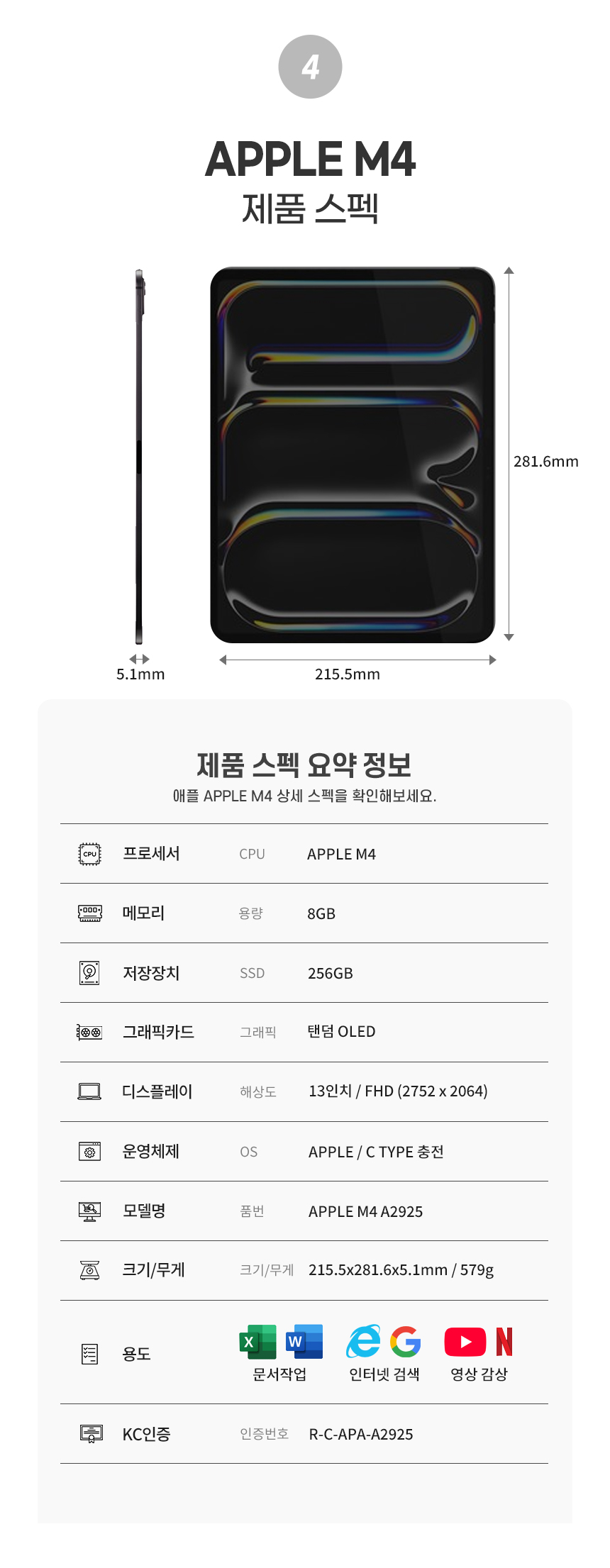 APPLE M4/텐담OLED/8GB/256GB/C Type/13"/2752x2064
